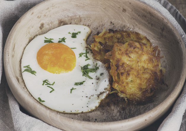 - Put the hash browns on side and turn on the heat to fry the eggs.